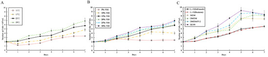 2.4. Effects of Medium, Temperature, and FBS on Cell Growth