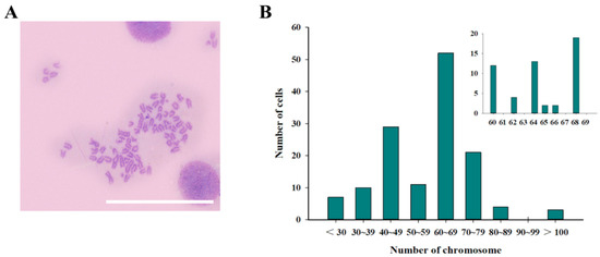 Chromosome morphology and frequency distribution of the number of entries in JFSP cells. (A) Chromosome morphology and (B) chromosome number statistics of JFSP cells treated with colchicine at 65 passage. Scale bar = 100 μm.