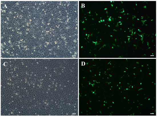 The expression of the GFP gene in JFSP cells 24 h after pEGFP-N1 transfection at passages 40 (A,B) and 80 (C,D). (A,C) Bright-field. (B,D) The expression of pEGFP-N1 in JFSP cells. Scale bar = 50 μm.