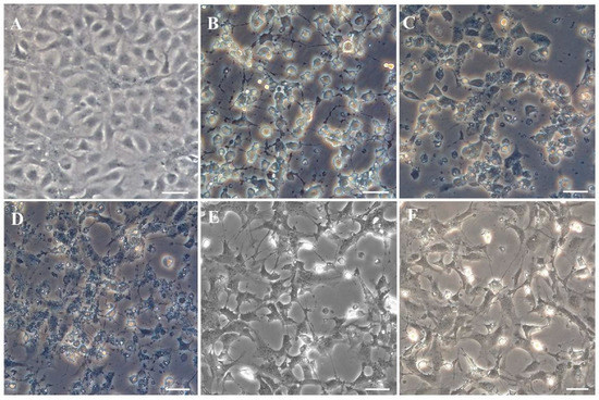 JFSP cells were tested for susceptibility to different viruses. CPE was observed in JFSP cells within 48 h after BIV, VHSV, HIRRV, IHNV, and LCDV infection. Figure A is a control (Figure 6A). JFSP cells became rounded, and cell monolayers disintegrated after being inoculated with the BIV virus for 24 h. Cell refractive index increased after 48 h, revealing clusters of grape-like cells, cell shedding, and filamentous intercellular bridges (Figure 6B). VHSV infection resulted in vacuolated and granular cells, cell disintegration, and cell fragmentation after 48 h. Complete disintegration and rounding were observed after three days (Figure 6C). HIRRV showed a lesion effect characterized by the disintegration of cell monolayers and rounding of cells, followed by an increase in refractive index and the appearance of granular and irregular cells at 48 h of infection (Figure 6D). Cells exhibited irregular margins after 48 h of IHNV infection, followed by disintegration of cell monolayers, a small number of rounded cells, and partial abscission, with inconspicuous nuclei and filamentous interstitial bridges after three days of infection (Figure 6E). LCDV infection caused an initial lesion effect, followed by disintegration of cell monolayers and atrophy, with rounded cells and filamentous interstitial bridges after three days of infection (Figure 6F).