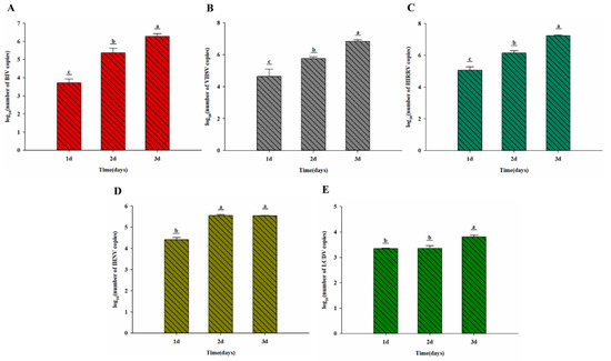 Replication characteristics of BIV, VHSV, HIRRV, IHNV, and LCDV in JFB cells. (A) BIV, (B) VHSV, (C) HIRRV, (D) IHNV, and (E) LCDV. Different letters denote significant differences among groups (p < 0.05).