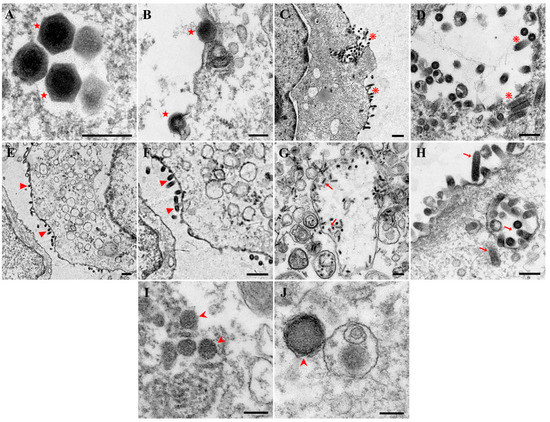 Ultrastructural observations of BIV, VHSV, HIRRV, IHNV, or LCDV-infected JFSP cells. Abundant virus particles were observed in BIV, VHSV, HIRRV, IHNV, or LCDV-infected cells. (A,B) Virus particles of BIV-infected cells. Scale bar = 200 μm. (C,D) Virus particles of VHSV-infected cells. (C) Scale bar = 500 μm. (D) Scale bar = 200 μm. (E,F) Virus particles of HIRRV-infected cells. Scale bar = 500 μm. (G,H) Virus particles of IHNV-infected cells. Scale bar = 200 μm. (I,J) Virus particles of LCDV-infected cells. Scale bar = 200 μm. ★: BIV, ❋: VHSV, ▶: HIRRV, ➞: IHNV, ➤: LCDV.