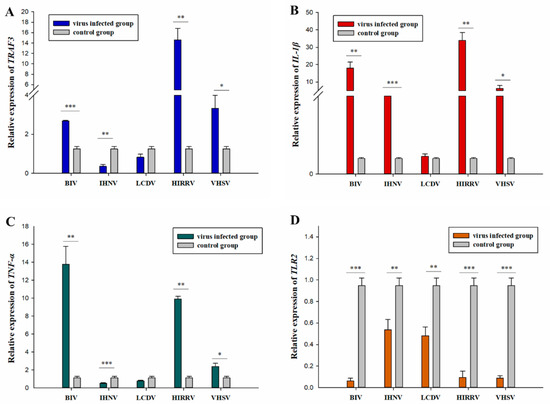 Expression of immune-related genes during infection of JFSP cells by BIV, VHSV, HIRRV, IHNV, or LCDV. (A–D) Relative expression levels of immune-related genes (TRAF3, IL-1β, TNF-α, and TLR2) in JFSP cells infected with the five viruses for 36 h p.i. Uninfected JFSP cells were used as a control group. All data are expressed as mean ± SEM (n = 3). * indicates a significant level of difference at p < 0.05, ** indicates a very significant level of difference at p < 0.01, and *** indicates an extremely significant level of difference at p < 0.001.
