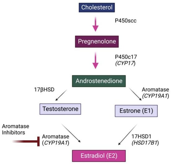 Simplified Biosynthetic Pathway for Estrogens. Estrogen synthesis begins with conversion of cholesterol to pregnenolone, which through a series of steps is converted into androstenedione, testosterone and estrone (E1). Testosterone is then converted into 17β-estradiol (E2) through the action of aromatase (CYP19A1). As also shown, aromatase can be inhibited by various aromatase inhibitors.