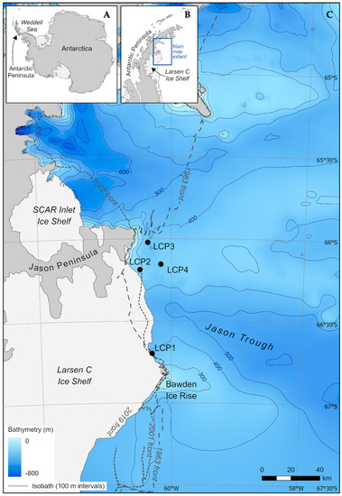 Over the last 50 years, considerable ice-shelf loss has occurred in Antarctica, which is predicted to continue in a warming world. Indeed, a recent study by Gilbert and Kittel [64] has suggested that within this century, one-seventh to over one-third of Antarctica’s ice shelves are at risk of destabilization and potential collapse if the global mean atmospheric temperature reaches 1.5 to 4 °C above pre-industrial temperature, respectively. Furthermore, Gilbert and Kittel [64] also identified Larsen C Ice Shelf, once neighbored to the north by the now-collapsed Larsen A and B Ice Shelves, as one of the most at-risk and vulnerable ice shelves in Antarctica. With such future ice-shelf losses projected, it can be anticipated that there will be intensification in disruption to continental shelf environments, ecosystems, and associated biotic communities, particularly near to and underneath ice shelves, with potential implications for their structure, functioning and carbon sink capacity [20,21,23,44,65].