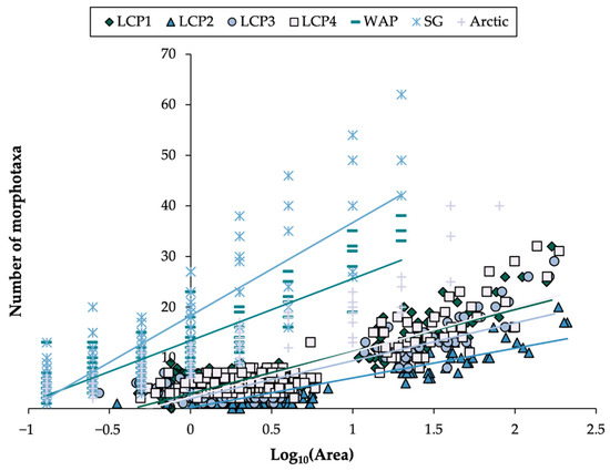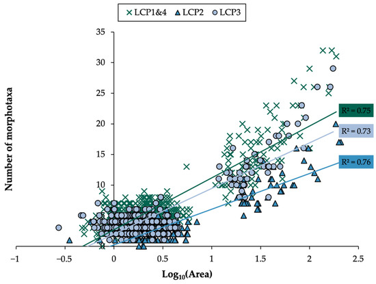Ice-shelf-adjacent sites accumulate faunal richness differently. Morphotaxa richness with area surveyed for sites LCP1-4 (note, slopes for LCP1 and LCP4 were not significantly different from each other, p > 0.2, therefore, datasets pooled). Significantly different slopes are shown (p-values for differences between slopes all <0.01). For regression lines, F-values = 1546.39, 767.44, and 930.35, for LCP1 and LCP4 combined, LCP2, and LCP3, respectively, with p-values all <0.001.