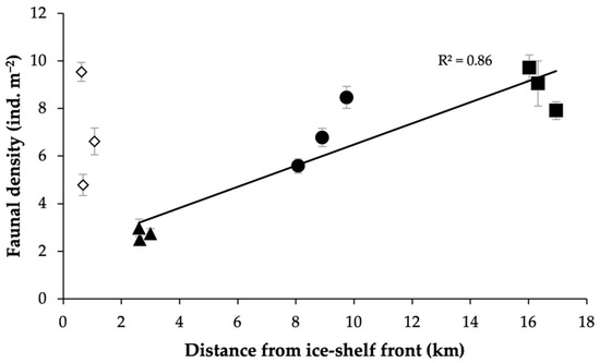 Megafaunal density generally increases with distance from the ice shelf. Mean benthic megafaunal density (ind. m−2) (±SE) of each sample (three per site) with distance from the ice-shelf front (km). Mean density (±SE) calculated for each sample using associated frames (minimum of 44 frames per data point). Site LCP1 = diamonds, LCP2 = triangles, LCP3 = circles, and LCP4 = squares. Symbols filled in white excluded from regression statistics (hence trend-line generation) (owing to water mass differences, see [90]).