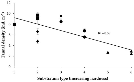 On exploring whether any functional groups could be considered a proxy (surrogate) for the wider faunal patterns observed, e.g., in density, deposit-feeding crawlers appeared to be the strongest surrogacy candidate (Figure 6; and see Figure S3 for pioneer sessile suspension feeders and hard sessile predator/scavengers). The functional group individually reflected the density pattern, and when removed from the broader dataset, the pattern remained, supporting that deposit-feeding crawlers did not drive the trend. Furthermore, and as above-mentioned, the density-trend of deposit-feeding crawlers with substratum type also reflected that of the overall fauna.