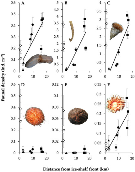 Functional group densities can alter differently relative to ice-shelf proximity. Mean functional group densities (ind. m−2) (±SE) of samples with distance from the ice-shelf front (km), with an example taxon for each group (images provided by D.K.A.B.): (A) deposit-feeding crawlers; (B) pioneer sessile suspension feeders; (C) hard sessile predator/scavengers; (D) grazers; (E) hard deposit-feeders; and (F) soft sessile predator/scavengers. Site LCP1 = diamonds, LCP2 = triangles, LCP3 = circles, and LCP4 = squares; white-filled symbols indicate (due to water mass disparities, see [90]) data not included in trend-line generation. R2 values for (A–C,F) = 0.63, 0.85, 0.74 and 0.70, respectively, and regression statistics indicated all associated p-values ≤ 0.01.