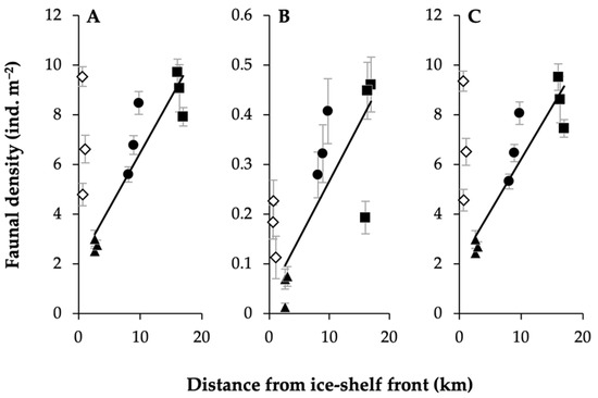 Deposit-feeding crawlers as an effective surrogate of the overall faunal density trend observed with distance from the ice shelf. Mean densities (ind. m−2) (±SE) with distance from the ice-shelf front (km) of: (A) overall fauna; (B) deposit-feeding crawlers; and (C) overall fauna excluding deposit-feeding crawlers. Site LCP1 = diamonds, LCP2 = triangles, LCP3 = circles, and LCP4 = squares; white-filled symbols indicate data not included in trend-line generation (because of water mass differences, see [90]). R2 values for (A–C) = 0.86, 0.63 and 0.85, respectively. Regression statistics for C presented a p-value of ≤0.001.