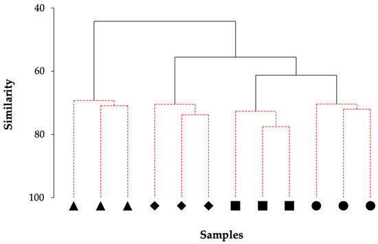 Clustering of samples corresponds with respective study site. Dendrogram resulting from hierarchical cluster analysis of samples from Larsen C study sites (based on Bray–Curtis similarities and using group-average linking). Black continuous lines indicate significant clusters, identified by a SIMPROF test, and red dashed lines indicate non-significant clusters. Site LCP1 = diamonds, LCP2 = triangles, LCP3 = circles, and LCP4 = squares.