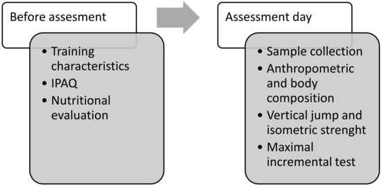 In the present quasi-experimental cross-sectional study, the assessments were performed between the second and third week after the start of the season in the following order: nutritional analysis, physical activity questionnaire, blood extraction and urine collection, anthropometry, vertical jump, isometric strength of the lower limb and maximal incremental test. The protocol was approved by the Biomedical Ethics Committee of the University of Extremadura (Spain), following the Helsinki Declaration of ethical guidelines for research on human subjects (135/2020). Figure 1 describes the study design and the order of the assessments conducted.