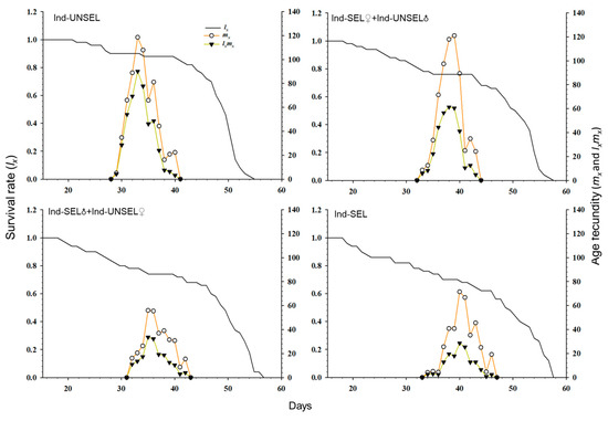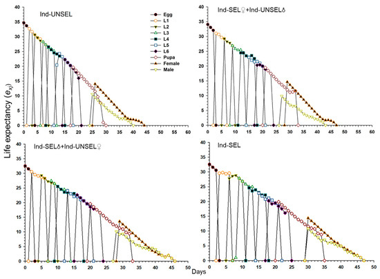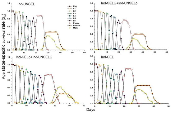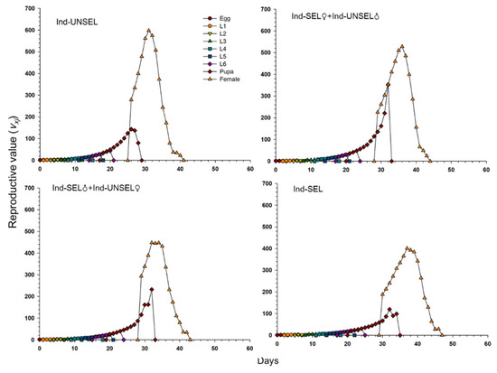82]. We evaluated fitness costs in two hybrid populations (Ind-SEL♂ × Ind-UNSEL♀ and Ind-SEL♀ × Ind-UNSEL♂) of the Ind-SEL and the Ind-UNSEL Population. We found significantly longer developmental time of larvae, extended pupal duration, shorter adult longevity, and lower fecundity in the Ind-SEL as compared with the other strains and Ind-UNSEL population. The only parameter that differs between Ind-SEL♂ × Ind-UNSEL♀ (175.68 ± 45.88) and Ind-SEL♀ × Ind-UNSEL♂ (328.03 ± 57.22) was the Net reproductive rate (
