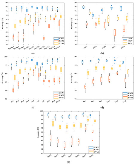 The CNN, SVM, and KNN classifier model performances, which were obtained as a result of the 50 times training-validation process for the selected features with the FPA-SVM wrapper approach proposed in the study, are compared with each other for the “bior”, “coif”, “db”, “fk”, and “sym” wavelet families in Figure 7.