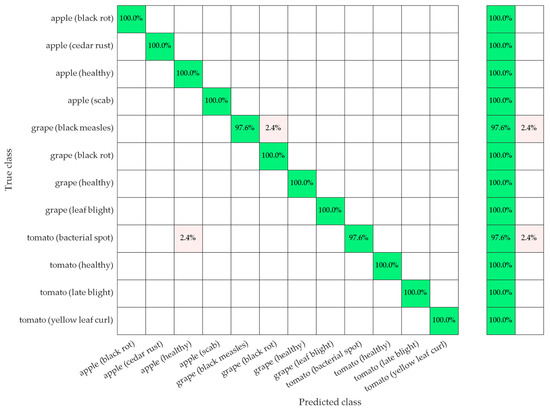 In the study, the best-performing model, which includes the 2D-DWT signal processing method based on the “sym7” wavelet family and the wrapper approach consisting of FPA-SVM and the CNN classifier, was embedded in the NVIDIA Jetson Nano artificial intelligence (AI) application development kit on the UAV, and real-time classification tests have been performed on apple, grape, and tomato plants. The results obtained as a result of the experiments performed on the test images are presented in Figure 8 in the form of a confusion matrix. It is seen that the model run in real time has a very low-level classification error for only two disease classes out of 12. The model predicts 2 out of 84 grape (black measles) test data as grape (black rot) disease classes. Similarly, the model classifies 2 out of 85 tomato (bacterial spot) test data as apple (healthy). The proposed model can classify both plant species and plant diseases in real time with high accuracy.
