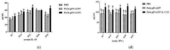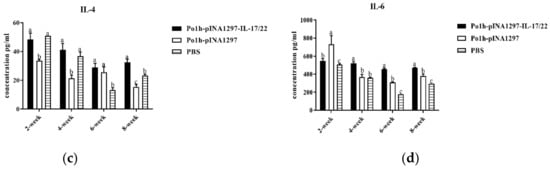 The IL-4 and IL-6 of the Po1h-pINA1297-IL-17/22 mice significantly increased compared to those of the PBS and Polh1297 mice from 14th to 56th days after inoculation (Figure 11c,d) (p < 0.05).