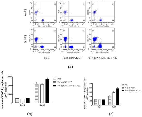 The T cell subtypes were analyzed in the blood by FCM. On the 35th day post the inoculation, CD4+ and CD8+ T cells markedly increased in the mice from the Po1h-pINA1297-IL-17/22 group compared to that in the PBS and Po1h-pINA1297 groups (Figure 6b,c) (p < 0.05).
