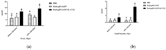 In the feces, the total SIgA in the Po1h-pINA1297-IL-17/22 group were significantly higher than the PBS and Po1h-pINA1297-IL-17/22 groups (Figure 7a) (p < 0.05). In the intestines of the Po1h-pINA1297-IL-17/22 group, the total SIgA was significantly elevated compared to other groups (Figure 7b) (p < 0.05). Furthermore, in the PBS and Po1h-pINA1297 groups, the concentrations of total SIgA did not show remarkable difference in either the feces or the intestines.