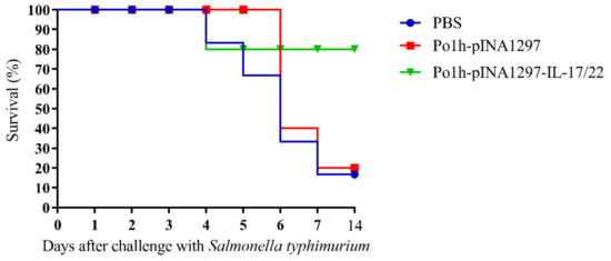 The survival percentage of mice is shown in Figure 8 according to 14 days observation after oral challenge at 35 days post inoculation with tolerance Salmonella typhimurium. The group treated with Po1h-pINA1297-IL-17/22 manifested the strongest protection against the infection, which exhibited 80% survival. Furthermore, 80% of the mice in groups PBS and Po1h-pINA1297 were dead after the challenge.