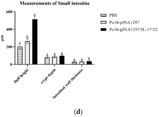 Hematoxylin and eosin staining of small intestine tissues. Histologic examination showed the fluff height, crypt depth, and intestinal wall thickness in PBS (a), Po1h-pINA1297 (b) and Po1h-pINA1297-IL-17/22 groups (c) and their statistical comparison (d) respectively. Scale bar = 100 µm. The data with different letter are significantly different, p < 0.05.