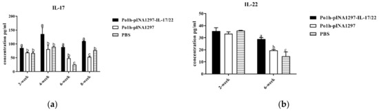As shown in Figure 11, the concentration of IL-17 (Figure 11a) in the Po1h-pINA1297-IL-17/22 group were significantly higher than that in the PBS and Po1h-pINA1297 groups (p < 0.05) during the whole observation. Moreover, the concentration of IL-22 (Figure 11b) in the Po1h-pINA1297-IL-17/22 group was significantly higher compared to that from the PBS and Po1h-pINA1297 (p < 0.05) on the 42nd day post the inoculation (p < 0.05).