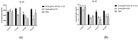 The levels of IL-15 and IL-23 in the Po1h-pINA1297-IL-17/22 group were significantly higher compared to the PBS and Po1h-pINA1297 group on the 42nd and 56th day post inoculation (Figure 12a,b) (p < 0.05).