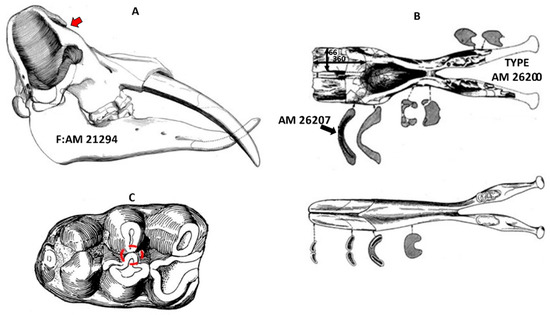 - Frick, C. New remains of Trilophodont-tetrabelodont mastodons. Bul. AMNH 1933, 59, 1883–1965. [Google Scholar]