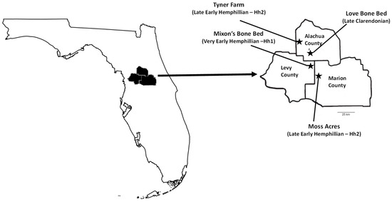 - Webb, S.D.; MacFadden, B.J.; Baskin, J.A. Geology and paleontology of the Love Bone Bed from the late Miocene of Florida. Am. J. Sci. 1981, 281, 513–544. [Google Scholar] [CrossRef]