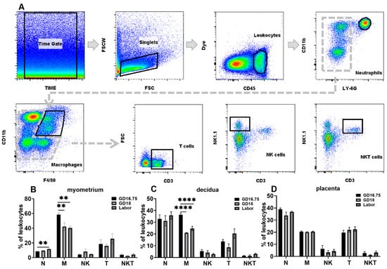 Dynamic changes of leukocyte subsets in myometrium, decidua, and placenta at late gestation and labor. The pregnant mice were sacrificed at GD16.75, GD18, and labor. Myometrium, decidua, and placenta were obtained for examination of the populations of neutrophils, macrophages, NK, T cells, and NKT cells by flow cytometry analysis. (A) Gating strategy used to identify neutrophils (Dye−CD45+CD11b+Ly6G+), macrophages (Dye−CD45+CD11b+F4/80+), T cells (Dye−CD45+CD11b−CD3+), NK cells (Dye−CD45+CD11b−CD3−NK1.1+), and NKT cells (Dye−CD45+CD11b−CD3+NK1.1+). (B) Populations of leukocyte subsets in myometrium; (C) populations of leukocyte subsets in decidua; (D) populations of leukocyte subsets in placenta. Data are expressed as mean ± SEM. n = 6 in each group. ** p < 0.01, **** p < 0.0001. N, neutrophils; M, macrophages.