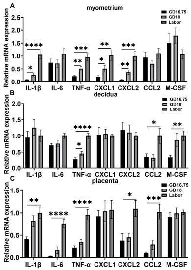 Dynamic changes of cytokine and chemokine expression in myometrium, decidua, and placenta from late gestation to labor. The pregnant mice were sacrificed at GD16.75, GD18, and labor. Myometrium, decidua, and placenta were obtained for determination of the mRNA levels of IL-1β, IL-6, TNFα, CXCL1, CXCL2, CCL2, and M-GSF by Q-PCR analysis. (A) Cytokine and chemokine mRNA levels in myometrium; (B) cytokine and chemokine mRNA levels in decidua; (C) cytokine and chemokine mRNA levels in placenta. Data are expressed as mean ± SEM. n = 6 in each group. * p < 0.05, ** p < 0.01, *** p < 0.001, **** p < 0.0001.