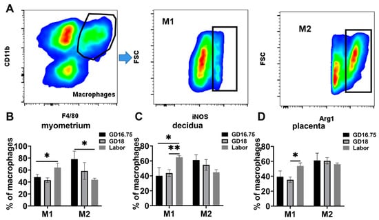 Characteristics in M1 and M2 populations in gestational tissues at late gestation and labor. The pregnant mice were sacrificed at GD16.75, GD18, and labor. (A) Gating strategy was used to identify M1 (Dye−CD45+CD11b+F4/80+iNOS+) and M2 (Dye−CD45+CD11b+F4/80+Arg1+). (B) Populations of M1 and M2 in myometrium; (C) populations of M1 and M2 in decidua; (D) populations of M1 and M2 in placenta. Data are expressed as mean ± SEM. n = 5 in each group. * p < 0.05, ** p < 0.01.