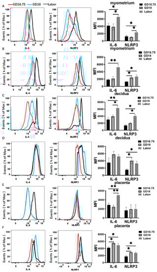 Characteristics in IL-6 and NLRP3 expression in gestational tissues at late gestation and labor. The pregnant mice were sacrificed at GD16.75, GD18, and labor. Myometrium, decidua, and placenta were obtained for determination of the expressions of IL-6 and NLRP3 by flow cytometry analysis. (A,B) Flow cytometry of IL-6 and NLRP3 expression among total leukocytes (A) or macrophages (B) in myometrium. (C,D) Flow cytometry of IL-6 and NLRP3 expression among total leukocytes (C) or macrophages (D) in decidua. (E,F) Flow cytometry of IL-6 and NLRP3 expression among total leukocytes (E) or macrophages (F) in placenta. Representative flow cytometry evaluating IL-6 and NLRP3 expressions (the left panel) and statistics calculated by the mean fluorescence intensity (MFI) of IL-6 and NLRP3 (the right panel) from total leukocytes (CD45+) or macrophages (CD11b+F4/80+). Data are expressed as mean ± SEM. n = 5 in each group. * p < 0.05, ** p < 0.01.