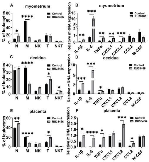 Changes in leukocyte subsets and cytokine and chemokine expression in gestational tissues at preterm labor induced by RU38486. Pregnant mice were administered RU38486 or vehicle at GD16. The mice with RU38486 were sacrificed after the onset of labor. The control mice were sacrificed at the corresponding time of the RU38486 group. Myometrium, decidua, and placenta were obtained for determination of leukocyte subsets and chemokine and cytokine expression. (A,B) Leukocyte subsets and cytokine and chemokine mRNA levels in myometrium; (C,D) leukocyte subsets and cytokine and chemokine mRNA levels in decidua; (E,F) leukocyte subsets and cytokine and chemokine mRNA levels in placenta. Data are expressed as mean ± SEM. n = 6 in each group. * p < 0.05, ** p <0.01, *** p < 0.001, **** p < 0.0001. N, neutrophils; M, macrophages.