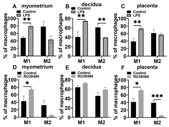 In the LPS-induced preterm birth model, the M1 population was significantly increased in the myometrium, decidua, and placentas during labor compared with the controls. The M2 population declined in the myometrium and decidua compared with the controls, although there was no statistical significance in the myometrium (Figure 7A–C). In the RU38486-induced preterm birth model (Figure 7D–F), the M1 populations were significantly increased in the myometrium and placenta and slightly increased in the decidua. The M2 populations were decreased in the myometrium (without statistical significance) and placenta.