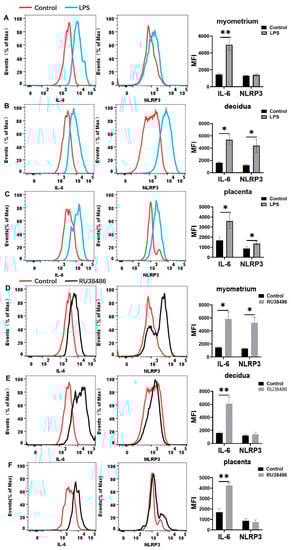 IL-6 and NLRP3 expression in gestational tissues at preterm labor induced by LPS and RU38486. Pregnant mice were administered LPS (A–C) at GD16.25 or RU38486 (D–F) at GD16. The mice with LPS or RU38486 were sacrificed after the onset of labor. The control mice were administered the same volume of saline and sacrificed at the corresponding time of LPS or RU38486 group. (A,D) Flow cytometry of IL-6 and NLRP3 expression in myometrium. (B,E) Flow cytometry of IL-6 and NLRP3 expression in decidua. (C,F) Flow cytometry of IL-6 and NLRP3 expressions in placenta. Representative flow cytometry evaluating IL-6 and NLRP3 expression (the left panel) and statistics calculated by the MFI of IL-6 and NLRP3 (the right panel) from macrophages (CD11b+F4/80+) in myometrium or decidua or placentas. Data are expressed as mean ± SEM. n = 5 in each group. * p < 0.05, ** p < 0.01.