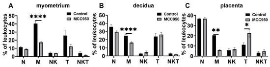 Effects of MCC950 treatment on leukocyte subsets in gestational tissues at term labor. Pregnant mice were administered MCC950 (i.p.) at GD18.5. The mice with MCC950 treatment were sacrificed at the onset of labor. The control mice were administered the same volume of saline and sacrificed at the onset of labor. Myometrium, decidua, and placentas were obtained for determination of neutrophils, macrophages, NK, T cells, and NKT cells by flow cytometry analysis. (A) Populations of leukocyte subsets in myometrium; (B) populations of leukocyte subsets in decidua; (C) populations of leukocyte subsets in placenta. Data are expressed as mean ± SEM. n = 6 in each group. * p < 0.05, ** p <0.01, **** p < 0.0001. N, neutrophils; M, macrophages.
