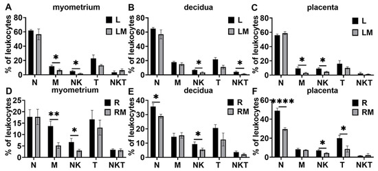 Effects of MCC950 treatment on leukocyte subsets in gestational tissues at the time of labor in LPS- and RU38486-induced preterm birth. Pregnant mice were administered LPS alone or LPS plus MCC950 at GD16.25 (A–C) or with RU38486 alone or RU38486 with MCC950 (D–F) at GD16. The mice were sacrificed after the onset of labor. Myometrium, decidua, and placentas were obtained for determination of neutrophils, macrophages, NK, T cells, and NKT cells by flow cytometry analysis. (A,D) Populations of leukocyte subsets in myometrium; (B,E) populations of leukocyte subsets in decidua; (C,F) populations of leukocyte subsets in placenta. Data are expressed as mean ± SEM. n = 6 in each group. * p < 0.05, ** p < 0.01, **** p < 0.0001. L, LPS; LM, LPS + MCC950; R, RU38486; RM, RU38486 + MCC950; N, neutrophils; M, macrophages.
