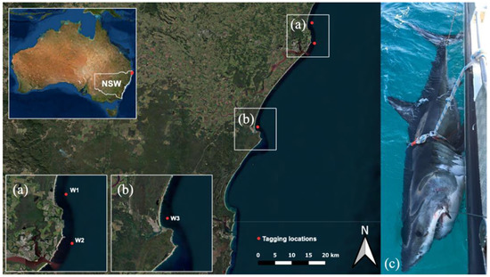 Location of tagging sites (red dots) on the northern New South Wales coast of eastern Australia. (a) Lennox Head, tagging site of white shark 1 (W1) and Ballina, tagging site of white shark 2 (W2), (b) Evans Heads, tagging site of white shark 3 (W3), and (c) W1 secured to the side of the vessel during tagging procedure (image provided by the New South Wales Department of Primary Industries). Map generated in QGIS.