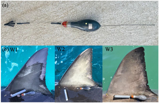(a) MiniPAT-348 Pop-up Satellite Archival Transmitting Tag and Domeier dart head used to anchor the MiniPAT tags and acoustic transmitters into the sharks musculature, and (b) dorsal fins of the three white sharks used in the present study. Images taken after completing tagging procedure, with MiniPAT tags, acoustic transmitters and conventional tags visible (images provided by the New South Wales Department of Primary Industries).