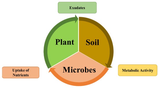 In the detention of soil, the enormous diversity of microbes, inclusive of bacteria species, archaea, and fungi, are precariously intricate with each other and involved in ecosystem functioning. According to an estimate, 1 g of soil may consist of 1010 to 1011 bacteria, 6000–50,000 bacterial species, and up to 200 m of myco-fungal hyphae, and most of them are propitious for plants and soils []. In recent days, intensive farming (by utilizing synthetic fertilizers and chemicals) has been the primary source of food for a growing population. These industrially composed chemical products cause eco-pollution and reduce the microbial population in the soil []. To secure biosafety, researchers are involved in the production of nutritious food under sustainable agriculture []. The interconnection between the plant, soil, and microbiomes is presented in Figure 2.