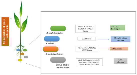 Presently, a change in the world’s climate and deleterious environmental conditions are playing an important role in the reduction of crop development, growth, and yield []. The manifestation of new varieties of crops (against stress) by implying genetic engineering and molecular breeding is costly and labor-intensive. So recently, the usage of growth-promoting rhizobacteria has been gaining huge popularity as an alternative approach for amelioration of stress in different crops []. Accordingly, Nautiyal, et al. [] observed PGP traits of B. amyloliquefaciens and its impact on Oryza sativa grown under salt-stress conditions. Salt-responsive genes, including NHX1, SOS1, BZ8, SAPK4, and SNRK2, have been reported in rice plants. The NHX1 and SOS1 were reported to be involved in Na+ and H+ exchange, respectively, and reduced cellular Na+ ion concentration. The SAPK4 gene controls ion homeostasis, improved growth, and development of plants under salt stress. The SNRK2 and BZ8 function in the ABA gene regulation pathway through osmotic signaling. In Brachypodium distachyon the application of B. subtilis increases the expression of LEA genes responding to drought stress []. Chen, et al. [] reported B. amyloliquefaciens inoculation is helpful in the expression of genes that help maize plants against salt stress. The HKT1, NHX1, NHX2, and NHX3 genes are related to ion balance and assist maize plants in becoming salt tolerant. Another study by Zubair, et al. [] highlighted two Bacillus strains, CJCL2 and RJGP41, for their potential role in mitigating cold stress and fostering plant growth in wheat plants. The reported genes for cold tolerance are DegS, desR, SodA, trxA, dpsU20, ResD, ohrR, desk, ComA, OpuAC, KatA, and perR. The pictorial representation of Bacillus spp. induced gene expression in plants under various stress conditions is presented in Figure 3.