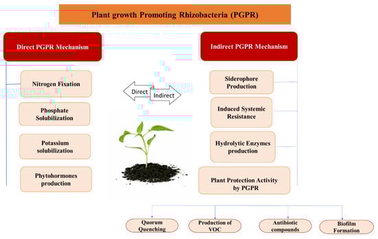 Plant growth-promoting bacteria, through various direct and indirect mechanisms, suppress the phytopathogens and promote plant growth, as presented in Figure 4. These mechanisms are discussed in detail below: