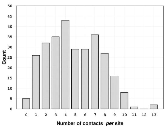 Distribution of the number of contacts per site established by the 289 urea molecules analyzed.