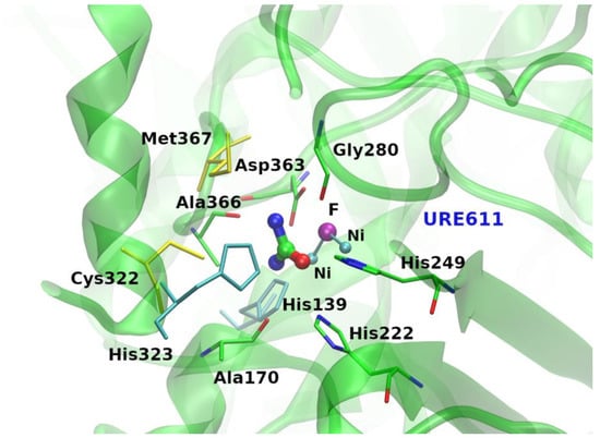 Binding site of the Sporosarcina pasteurii urease protein (PDB ID: 6qdy []) where urea makes the largest number of contacts. Hydrogen bonds with main and side chains of both aliphatic and hydrophobic amino acids, nonpolar interactions with protein atoms as well as with ions stabilize urea (URE611) in the present binding site. Yellow and cyan sticks represent aliphatic and aromatic van der Waals-type contacts, respectively.