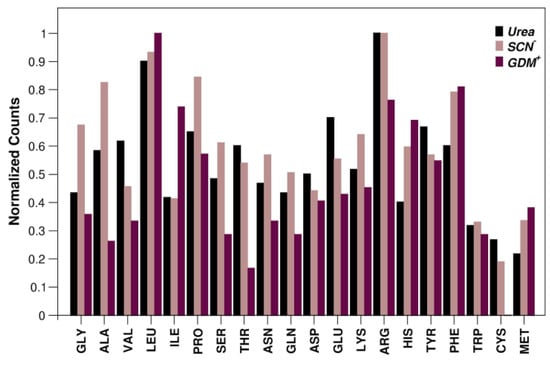 Representativeness of residue type involved in van der Waals-type interactions per urea, SCN− and Gdm+ sites. Normalized values are given as the ratio of the observed value to the maximum value of the determined distribution. Data corresponding to SCN− are retrieved from reference []; distribution referred to Gdm+ is generated using database of reference []. See also Figure S4.