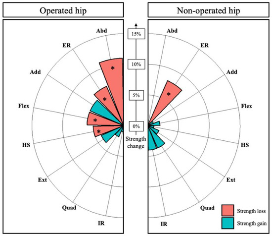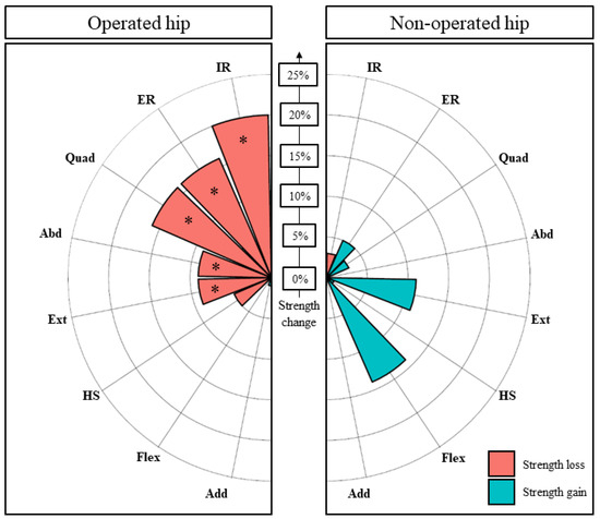 Pre- to postoperative changes in muscle strength (%) on the operated and non-operated hips. * indicates a statistically significant variation. Internal rotators (IR), external rotators (ER), quadriceps (Quad), abductors (Abd), extensor (Ext), hamstrings (HS), flexors (Fl), adductors (Add).
