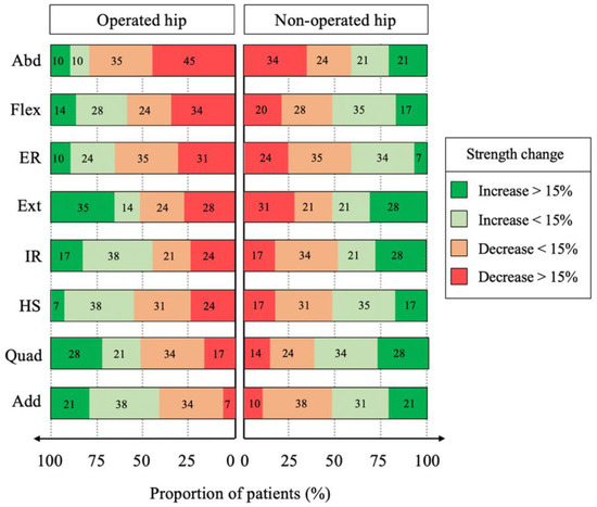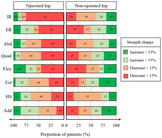 Among the muscles that were significantly weakened by surgery, the proportion of patients who experienced a strength reduction by 15% or more was 24% for the hamstrings, 31% for the external rotators, 34% for the flexors and 45% for the abductors on the operated side as well as 24% for the external rotators on the non-operated side (Figure 3).