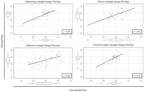 The correlation of muscles strength change between the operated and non-operated hips was moderate for the abductors (r = 0.56; 95%CI, 0.24–0.77) and strong for the hamstrings (r = 0.78; 95%CI, 0.57–0.89), flexors (r = 0.75; 95%CI, 0.52–0.87) and external rotators (r = 0.73; 95%CI, 0.50–0.87) (Figure 4).