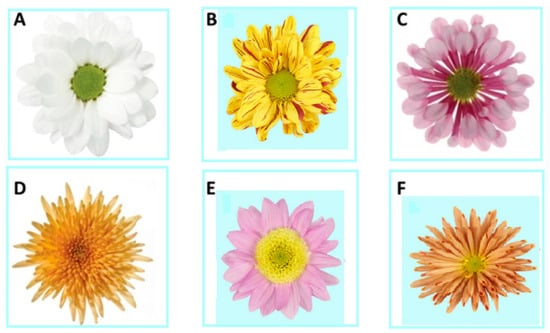 The term ‘chrysanthemum’ comes from the Greek ‘krus anthemon’, which means gold flower, and was initially used in China. Chrysanthemum morifolium (Ramat), belonging to the Asteraceae family [], is considered the second most important floricultural crop worldwide after roses []. This is a culturally significant flower with an annual sale of billions of branches. It is propagated in diverse colors, sizes, and forms of composite Chrysanthemum flowers by collecting several combinations, concentrations, and types of anthocyanins (purple), carotenoids (yellow), and chlorophyll (green) (Figure 1).