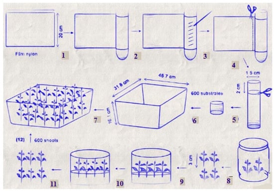 Microponic systems are reproduction systems that combine the benefits of micropropagation with hydroponics, which reduces the disadvantages of micropropagation systems of contamination, resource consumption, and the requirement for large spaces [,]. The pioneers of this method were [,], who used the nutrient film technique and a miniature pump to circulate medium through Rockwool (Figure 2). In addition, the culture conditions such as improved fresh and dry weight, rate of photosynthesis, leaf size and number, and stomatal density (temperature, CO2, humidity, pH, and electrical conductivity) are controlled. Tung et al. [,] concluded with a distinction between the microponic (MO) and micropropagation (MR) systems. In a microponic system, the volume of the container is 16.1 cm × 31.8 cm × 45.7 cm; the content of the medium = ½ MS, without sugar, pH 5.8); the substrate used is Nylon film, and there is no autoclave. While in the micropropagation system, the volume of the container is a 500 mL glass bottle; the content of the medium = ½ MS, 30 gL−1 sucrose and pH 5.8; the substrate is 8 gL−1 agar, and the method of sterilization is autoclave (121 °C at 1 atm for 30 min) []. The length of the chrysanthemum shoots utilized was 3 cm, grown on half-strength sugar-free liquid MS media under a 70/30% red/blue LED setup with 7.5 ppm silver nanoparticles. Chrysanthemums grown in a microponic system began flowering after 15 weeks, which was a week earlier than those grown in vitro, and branches derived from microponic culture may blossom one week earlier than micropropagation-derived branches.